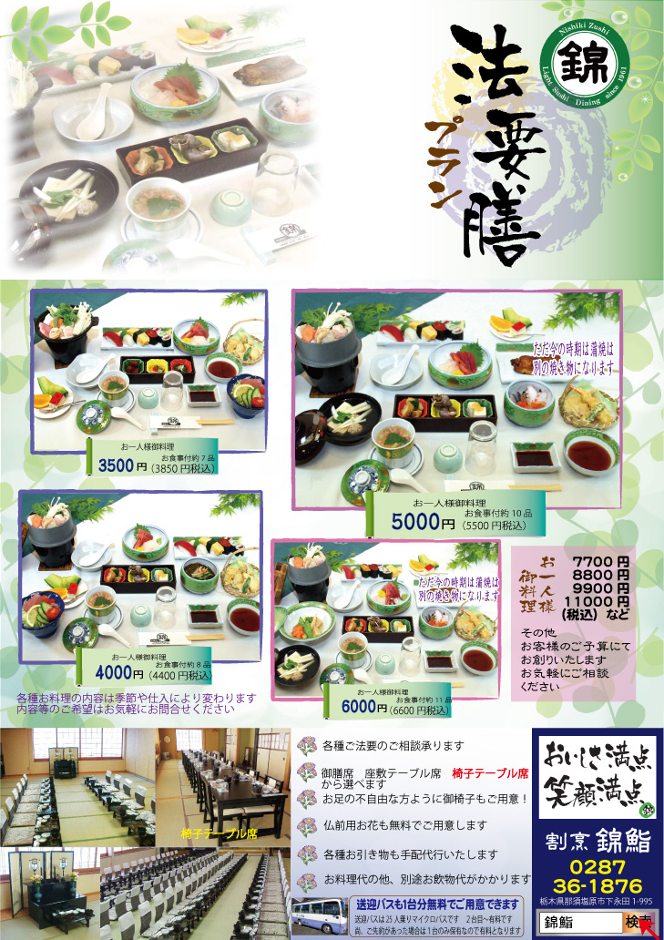 ご精進あげ 納骨 49日 一周忌 三回忌 七回忌 などの ご法事ご法要の懐石コースです 只今、バスでの送迎が人員不足のため出来ません 誠に申し訳ございません お気軽のご相談ください 0287-36-1876